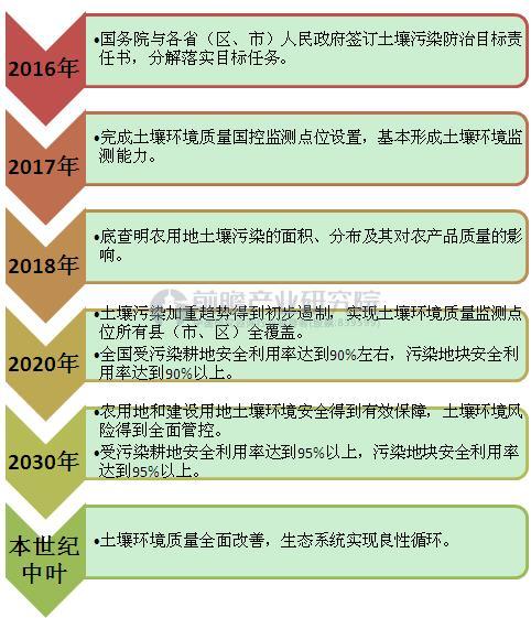 “土十條”對(duì)今后一個(gè)時(shí)期我國(guó)土壤污染防治工作做出了全面戰(zhàn)略部署,明確定下了未來(lái)兩個(gè)五年計(jì)劃的目標(biāo):到2020年,全國(guó)受污染耕地安全利用率達(dá)到90%左右,污染地塊安全利用率達(dá)到90%以上。到2030年,受污染耕地安全利用率達(dá)到95%以上,污染地塊安全利用率達(dá)到95%以上。