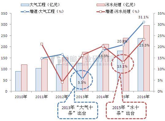 根據(jù)前瞻產(chǎn)業(yè)研究院發(fā)布的《2017-2022年中國(guó)環(huán)保行業(yè)發(fā)展前景與投資預(yù)測(cè)分析報(bào)告》數(shù)據(jù)顯示,2013年“大氣十條”出臺(tái)后,2014年、2015年大氣污染治理增長(zhǎng)率分別為18.3%、20.8%,而2013年這一數(shù)值僅為5.5%;2015年“水十條”出臺(tái)后,2016年污水處理增長(zhǎng)率為23.3%。